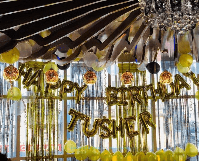 Golden Happy Birthday Foil Banner | 1 Set Foil Word Balloon | 6 Pieces Golden Balloons | 20 Pieces Black Balloons | 20 Pieces Snow Spray | 2 Pieces Foil Curtain (Golden & Silver) | 2 Pieces Free Gifts: Spark Candle | 1 Piece