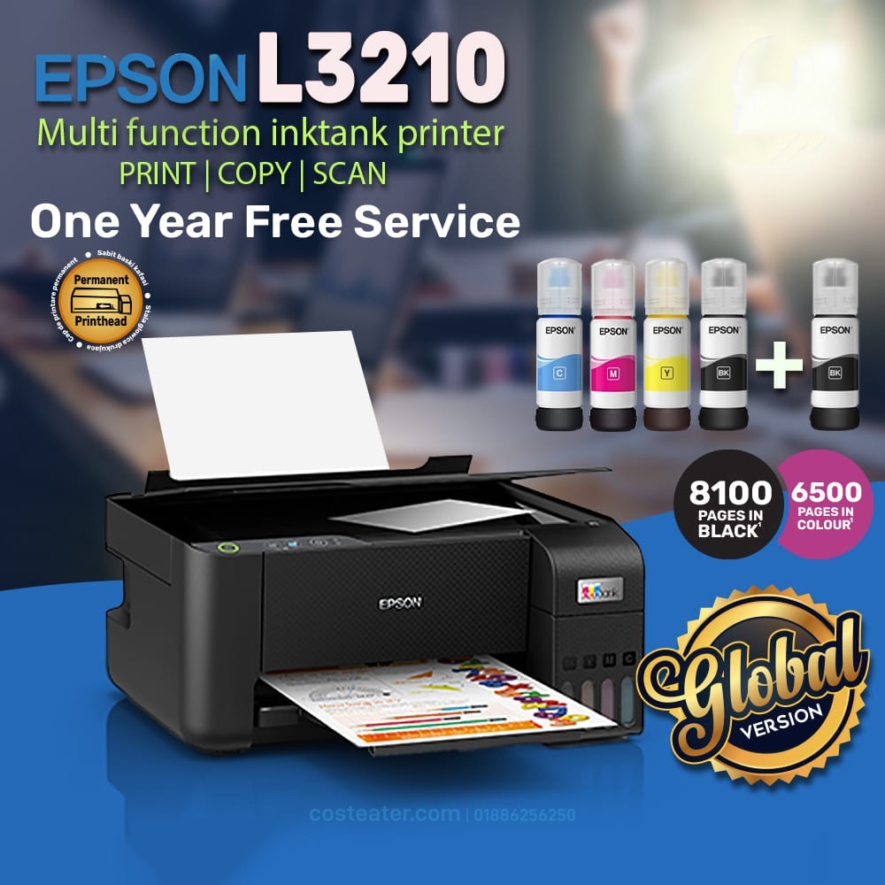 Epson EcoTank L3210 is Multifunction InkTank Printer. This printer is designed to improve business cost savings and print productivity. Expect a high print yield of up to 4,500 pages for black-and-white, and 7,500 pages for colour. You can even print borderless photos up to 4R size. The integrated ink tanks and designated nozzles ensure spill-free and error-free refilling. This printer supports with Legal (8.5 x 14 inch), Indian-Legal (215 x 345 mm), 8.5 x 13 inch, Letter, A4, 16K (195 x 270 mm), B5, A5, B6, A6, Hagaki (100 x 148 mm), 5 x 7 inch, 5 x 8 inch, 4 x 6 inch, Envelopes: 10, DL, C6 Print Paper. The Printer is compitable with Black Ink Bottle: 4,500 Pages, 003 (C13T00V100 / C13T00V199, Cyan Ink Bottle: 7,500 Pages, 003 (C13T00V200 / C13T00V299, Magenta Ink Bottle: 7,500 Pages, 003 (C13T00V300 / C13T00V399, Yellow Ink Bottle: 7,500 Pages, 003 (C13T00V400 / C13T00V499 ink bottles. This latest Epson EcoTank L3210 printer has 01 year warranty.