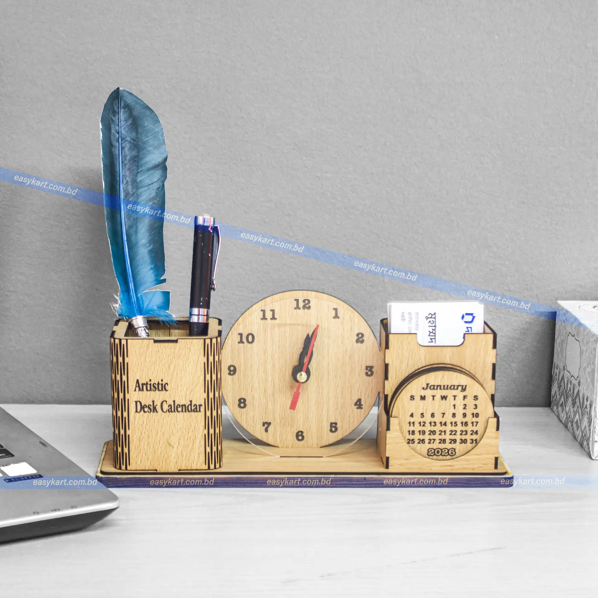 Crafted from 2mm premium MDF board and supported by a 5mm solid wooden base, this set includes a classic analog clock, a mini wooden calendar, a pen holder box, and a business card holder — all perfectly arranged on a single platform for a neat and functional desk setup.